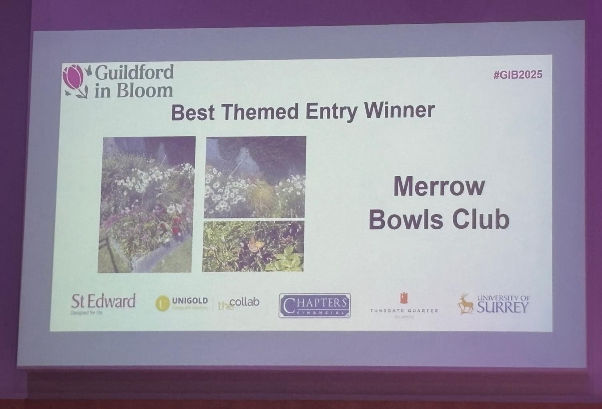 “The Merrow Bowls Club members have created a beautiful surrounding garden to their bowls green, with wild areas of nettles, wildflowers and plants for pollinators abounding, many grown from seed. A butterfly shaped bug hotel (4’ across) made by a member, is practical and beautiful. Basket woven butterfly stakes also made by members, decorate. Nettle tea is made to feed the bowling green, compost bins are carefully filled and rotated, all by volunteer club members, with many turning out to tell us all about it… their enthusiasm and care was outstanding”.